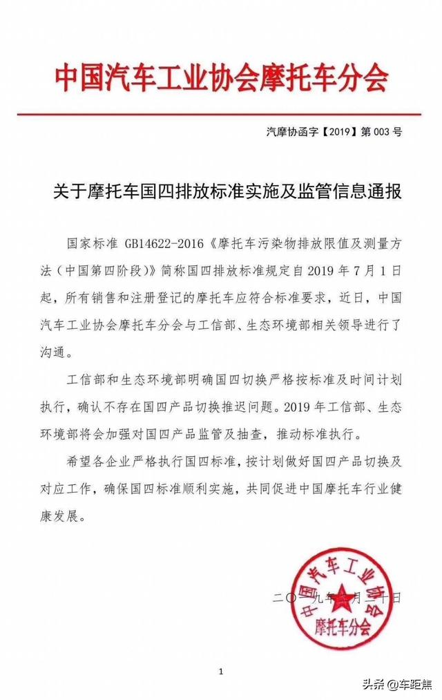 2月份,摩信網收到了關于摩托車排放升級的通報文件。中國汽車工業協會摩托車分會發布的通報稱,自2019年7月1日起,所有銷售和注冊登記的摩托車都應滿足國四排放標準,確認不存在國四車型推遲的消息。