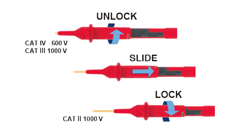 測試線和護(hù)套設(shè)計成一體化。可以通過滑動測試導(dǎo)線上的手指保護(hù)裝置輕松切換測量等級。此外,也不必?fù)?dān)心會丟失護(hù)套。