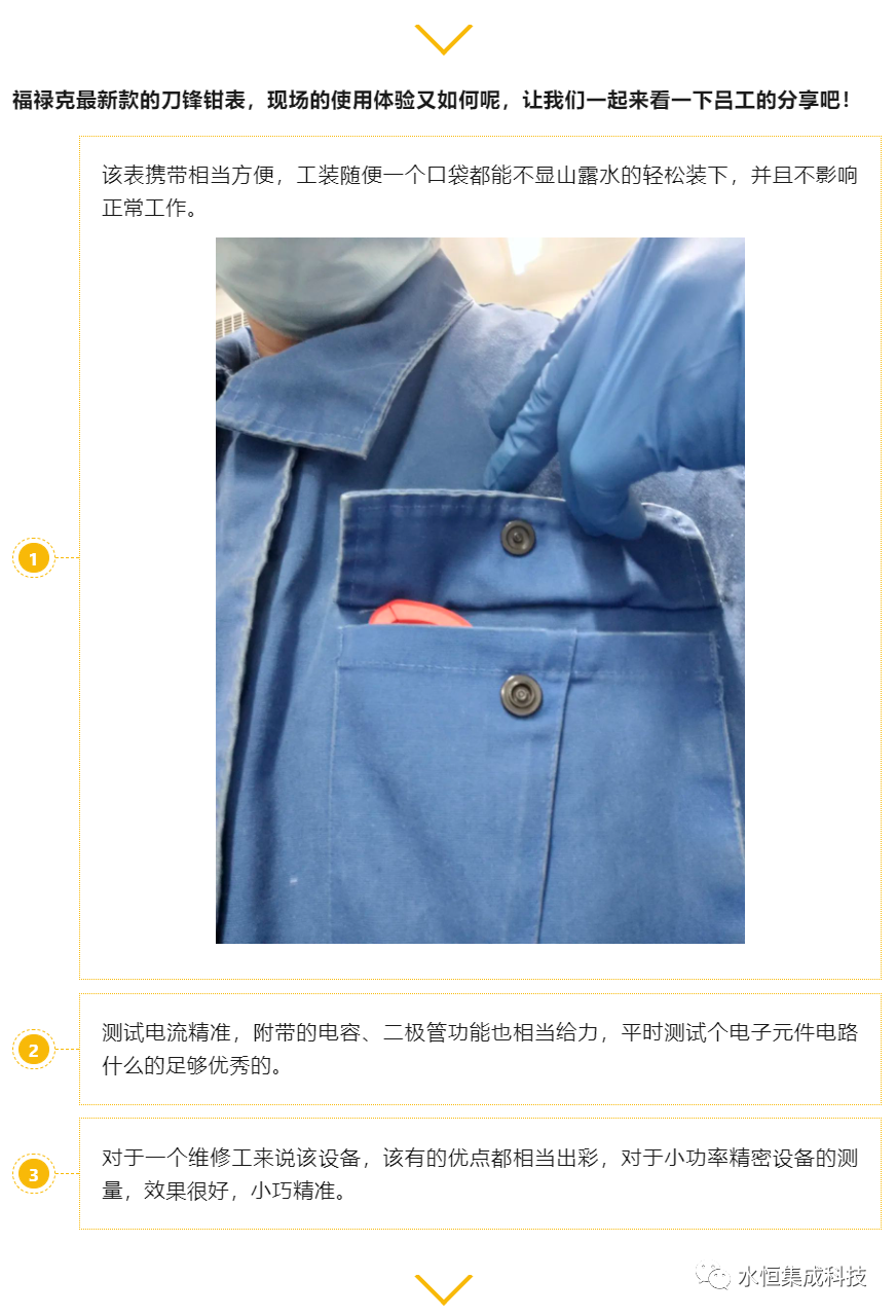 呂工主要負責廠里電氣設備的日常巡檢維護,使用頻率很高的是福祿克的F15B+萬用表,不僅表本身相當耐造,表筆上手也感覺相比之前使用的質感更勝一籌。