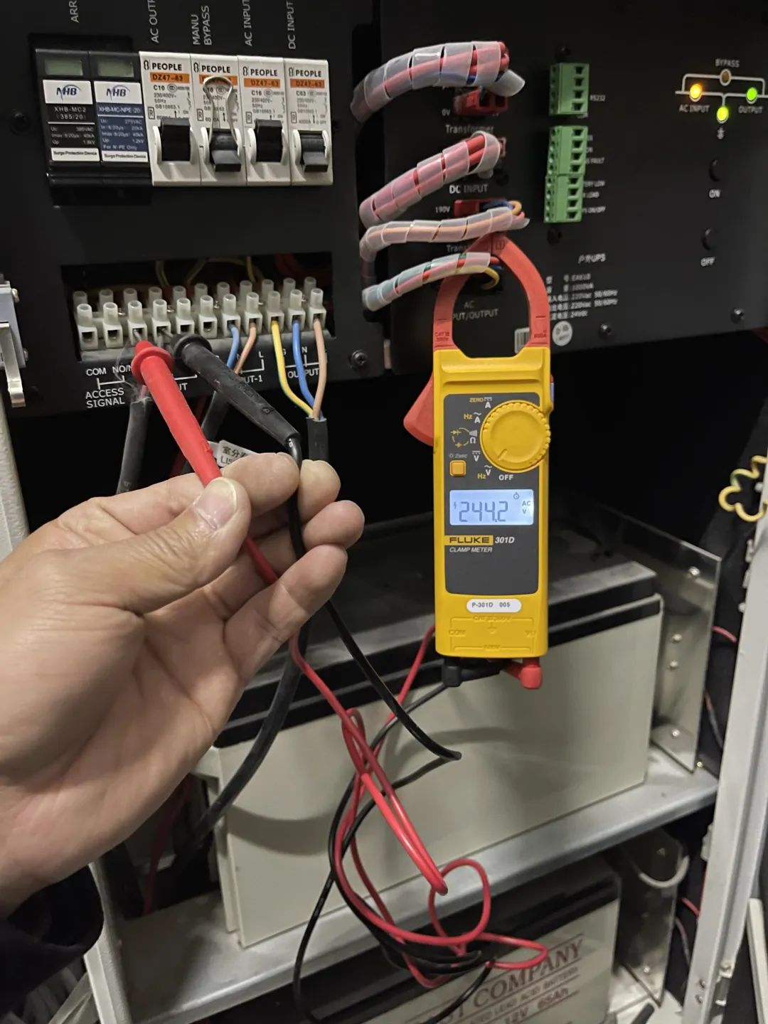 ·通訊要求電壓的穩(wěn)定度比較高,所以一般檢測(cè)內(nèi)容為輸入交流電壓和電流是否正常。本次檢測(cè)是遇到故障燈點(diǎn)亮,需要測(cè)試是否有正常的市電進(jìn)來(lái)。正常電壓需在244V以內(nèi),使用301D測(cè)試電壓,有一路電壓為244.2V超出范圍,需要調(diào)整變壓器的線路進(jìn)行維修。