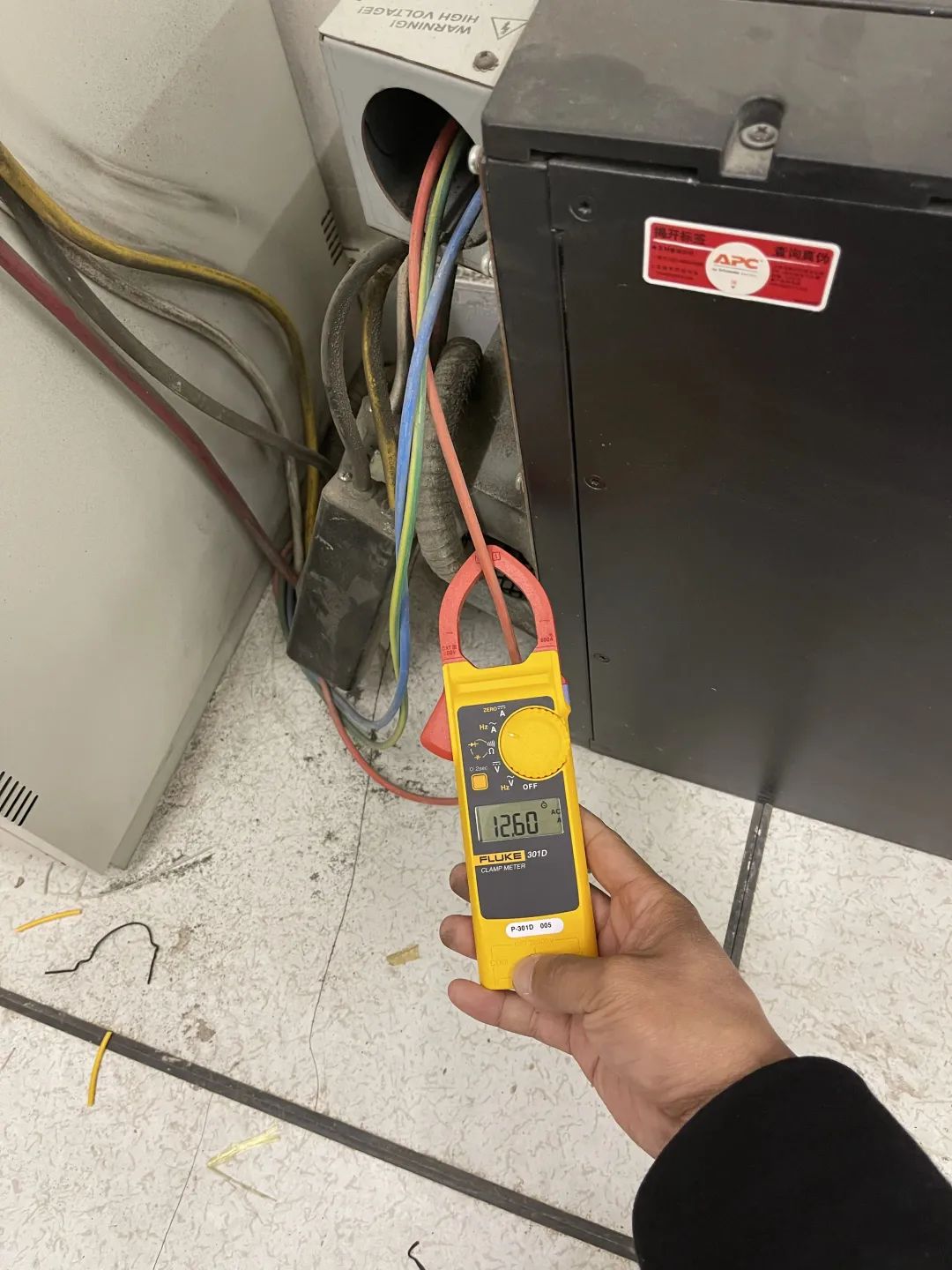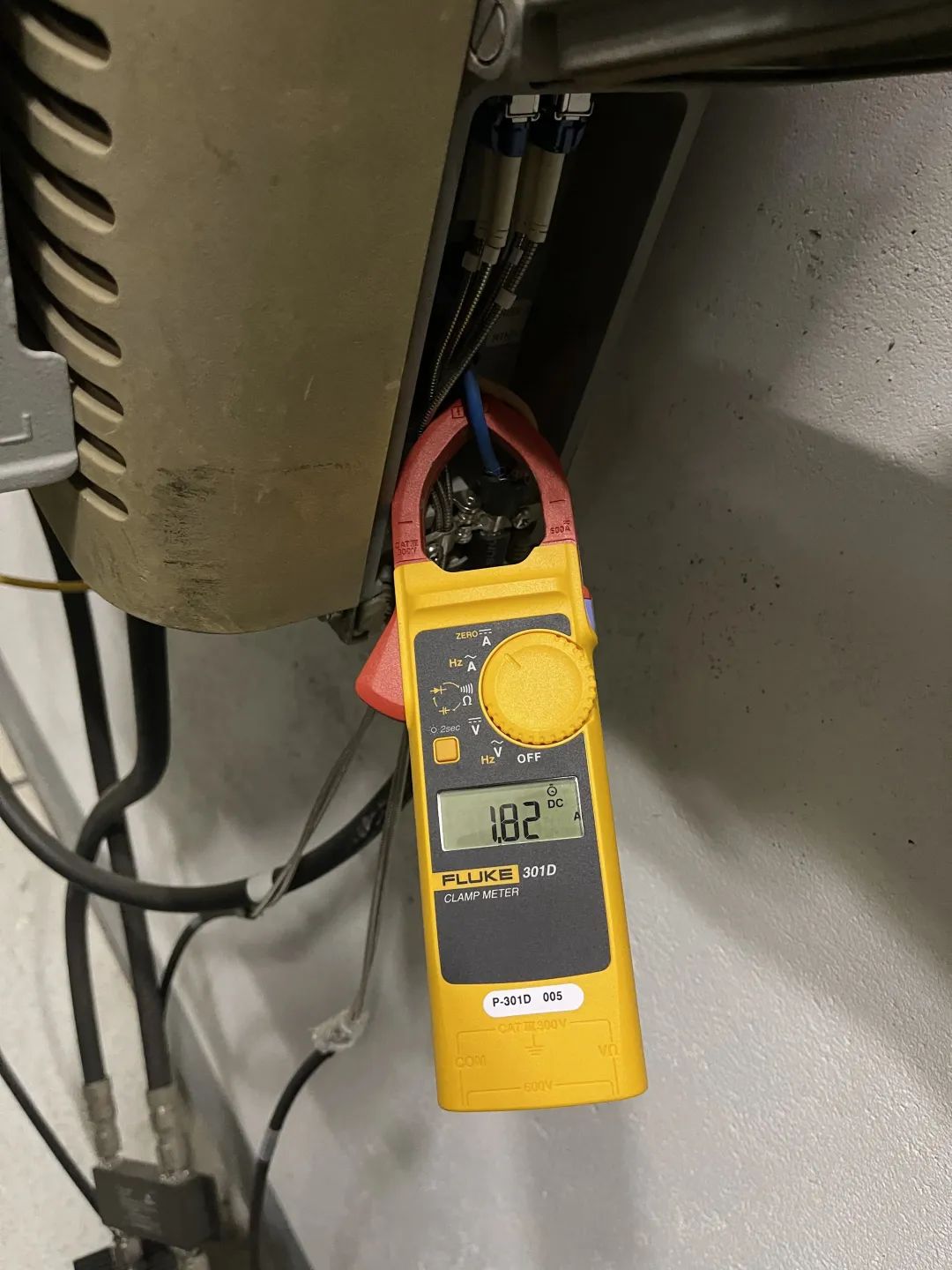 ·對(duì)室內(nèi)或天花板的一些通訊設(shè)備末端進(jìn)行電流測(cè)試,排查到其中一個(gè)設(shè)備的電流為1.82A,相對(duì)偏大。