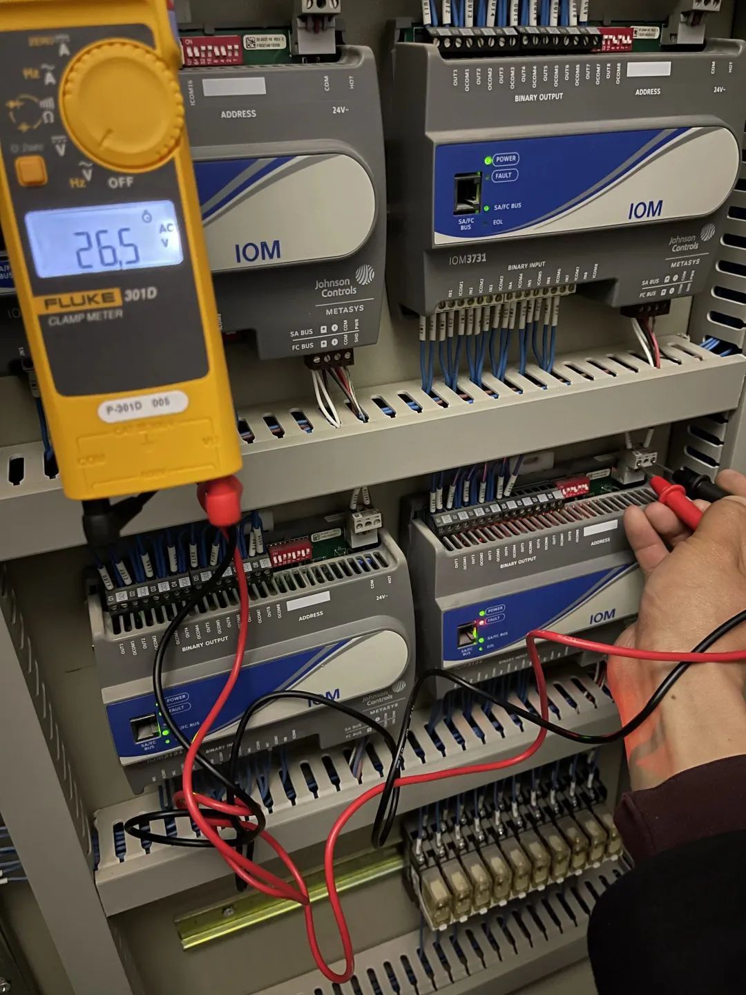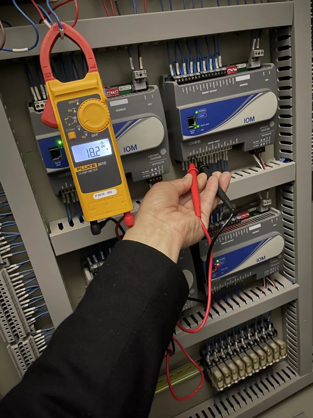·樓宇自動(dòng)控制柜負(fù)責(zé)整個(gè)樓層的照明、通風(fēng)、供暖和新風(fēng)系統(tǒng)。本次故障排查是發(fā)現(xiàn)有一個(gè)模塊亮紅燈,且后臺(tái)反應(yīng)前端有一個(gè)執(zhí)行器無(wú)反應(yīng)回饋。找到對(duì)應(yīng)樓層的柜子后,根據(jù)柜子編號(hào)圖紙測(cè)試各路電壓電流數(shù)值是否正常,逐個(gè)排查是哪個(gè)執(zhí)行器產(chǎn)生問(wèn)題。
